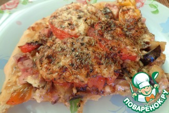 куриное мясо, сладкий перец, нарезанный кружочками, посыпаем орегано.