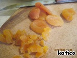 Курагу ошпарить кипятком, обсушить, порезать на кусочки и добавить к творогу.
