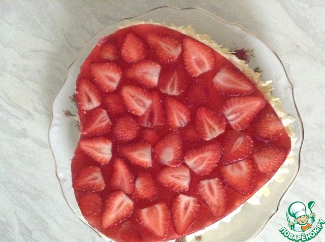 На крем уложите ломтики клубники. Залейте их готовым желе. Рецепт приготовления смотрите на упаковке. Если его нет, приготовьте простое прозрачное желе из воды и сахара.