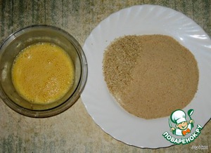 Взбить яйца в одной тарелочке и перемешать панировочные сухари с кунжутом в другой тарелочке.