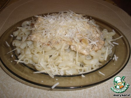 • Кладем поверх макарон и присыпаем сыром Пармезаном или Грано Падано. Вкусно и быстро. Приятного аппетита.