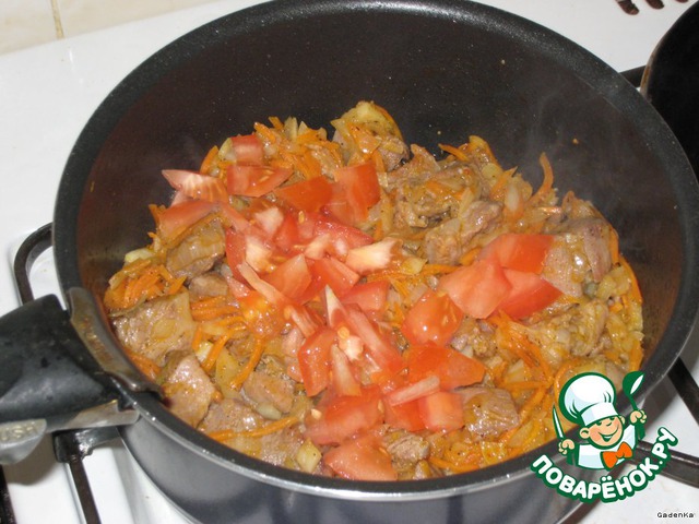 8. Помидор порезать на кубики и добавить к мясу, обжарить 2-3 минуты.