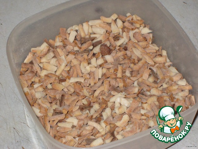 3. Тесто разделить на две части. Каждую раскатать в пласт, толщиной 1 мм, разрезать на полоски (примерно 4-5 см) и разрезать полоски на лапшу. Сложить на противень и зарумянить в разогретой духовке до 200 градусов, до золотистого цвета. Остудить.
