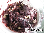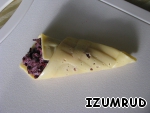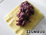 На разделочную доску кладём пласт сыра и на него начинку свекольно-ореховую.