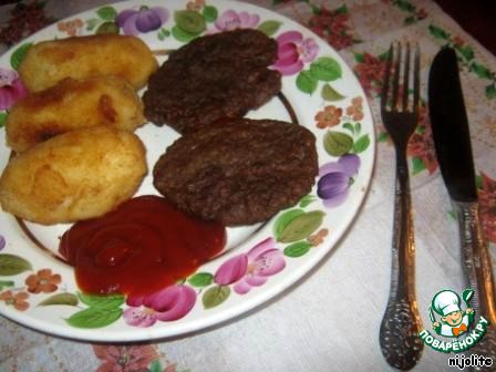 Подаем с любым гарниром или просто с овощным салатиком. У меня сегодня картофельные крокеты и кетчуп.