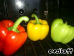Болгарские перцы кладем в горячую духовку и нагреваем, пока бока не начнут темнеть. Я ставила на 220 градусов, зеленый лежал 20 мин., а желтый и красный 30 мин. Но смотрите сами, у всех духовки разные.