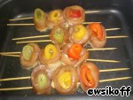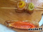 На полоску куриного филе кладем полоску перца и сворачиваем в виде розочки. На каждую шпажку нанизываем по три розочки - зеленая, желтая, красная, чтобы получился светофор.