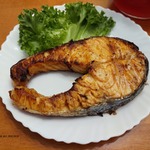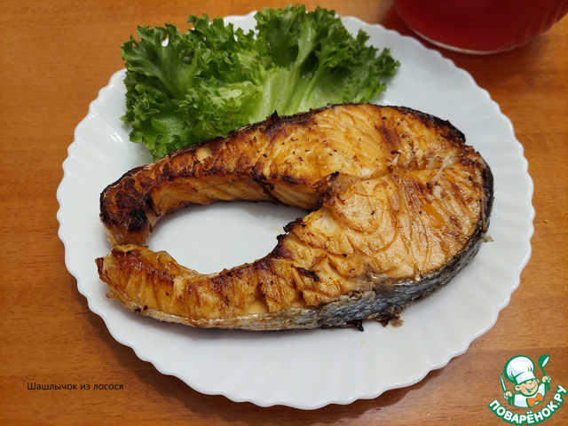 На берегу по-походному на кирпичиках устроили мангал и развели небольшой огонь. На три шампура нанизали кусочки лосося и за 15 - 20 минут наш шашлык был готов. Рыба очень сытная и вкусная. Ели с отварным картофелем, помидорами черри, оливками и зеленью - зелёный салат, зелёный лук, базилик и черемша.