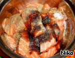 Вчера вечером нарезала филе лосося на 21 стейк весом по 0,75 гр. Поместила в кастрюлю и заправила специями - чёрный перец, смесь пяти перцев, немного соли, сахара, прованские травы, оливковое масло и соевый соус.