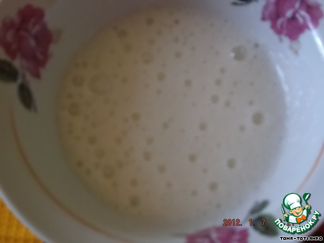 • Желтки смешать с молоком и растительным маслом, добавить сухарную смесь и соду (гашенную), всё перемешать. Осторожно ввести взбитый белок. Оставить на 5 минут.
