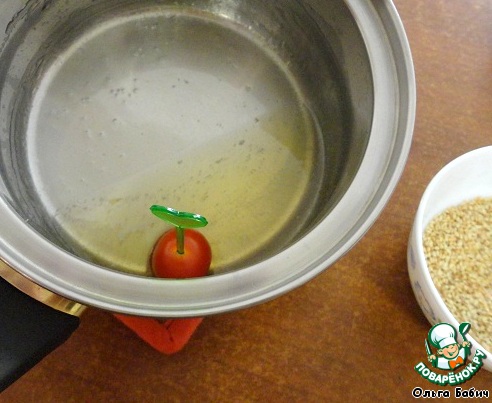 Обжарить кунжут до золотистого цвета.