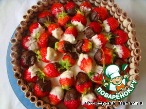 Затем берем шоколад, растапливаем на водяной бане или в микроволновке. Обволакиваем клубничку и, чередуя по цвету, выкладываем на поверхность торта.
