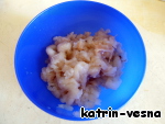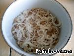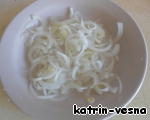 Затем необходимо порезать лук очень тоненкими полукольцами и замариновать в уксусе.