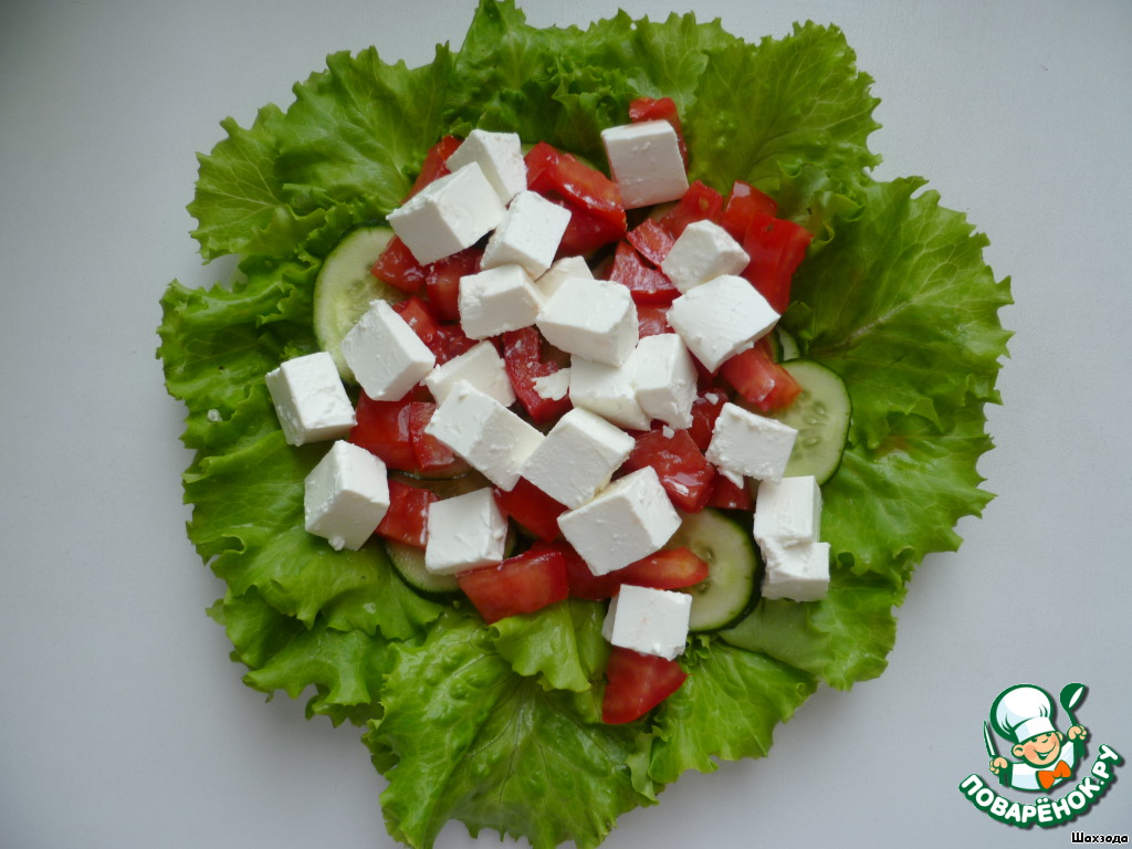 На тарелку выкладываем листья салата, кружочки огурцов.