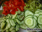 Перец и один огурец нарезаем соломкой, 2-й огурец кружочками, помидор кубиками.