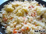 К овощам добавляем рис, перемешиваем, даем рису слегка пропитаться маслом и добавляем на сковороду 3 стакана воды и соль. Перемешиваем, накрываем крышкой и оставляем на очень маленьком огне минут на 15. Потом рис перемешиваем, если надо - можно добавить немножко воды или бульона и готовим под крышкой еще минут 5-10. Затем огонь выключаем, а рису еще даем постоять и пропитаться минут 10-15. Будет ли рис рассыпчатым и рисинка к рисинке очень зависит от сорта риса. Для рассыпчатого красивого риса я рекомендую использовать рис сорта Басмати.