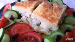 Очищенный картофель нарезать маленькими кубиками и смешать с горячими ещё курицей и грибами. Отставить в сторону примерно на 20 мин. Жидкость в это время почти впитается в картофель и начинка остынет.