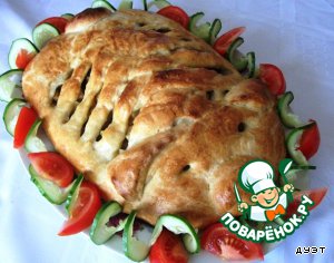 Края накрыть и подвернуть. Перенести пирог на противень.