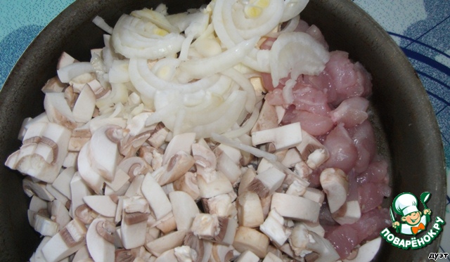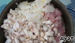 Займёмся начинкой: Филе курицы и шампиньоны нарезать кусочками, лук - полукольцами, добавить сливочное масло.