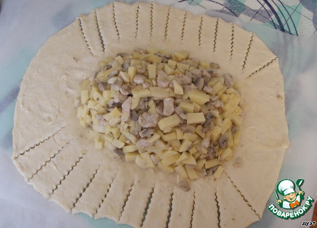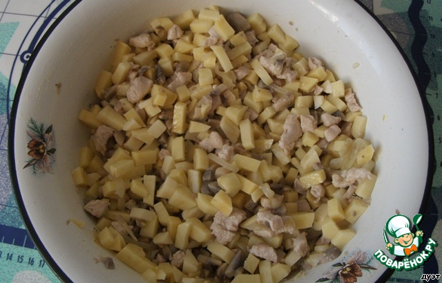 Очищенный картофель нарезать маленькими кубиками и смешать с горячими ещё курицей и грибами. Отставить в сторону примерно на 20 мин. Жидкость в это время почти впитается в картофель и начинка остынет.