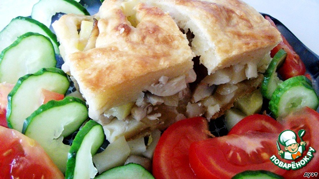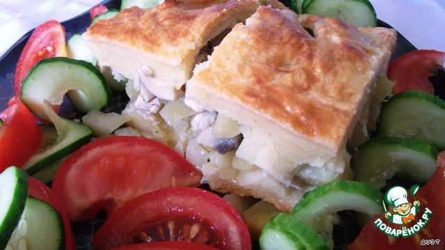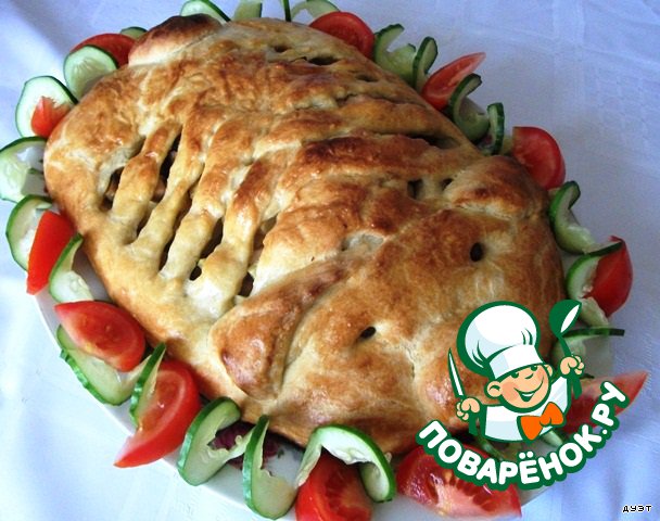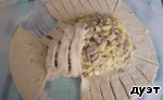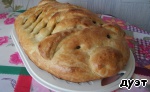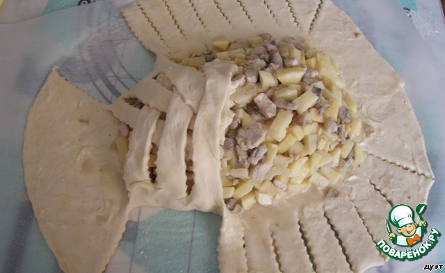 Края накрыть и подвернуть. Перенести пирог на противень.