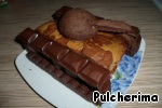 Дальше берем шоколадку и вдоль отламываем (а лучше ножичком отрезаем, т.к. может поломаться в ненужном месте), длинные полоски шоколадки и укладываем их вдоль бортиков пирога.