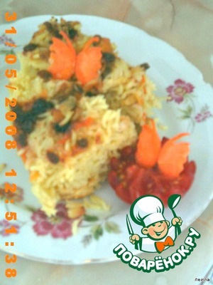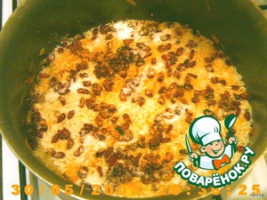 Выкладываем рис, посыпаем барбарисом, куркумой, солим, перчим.