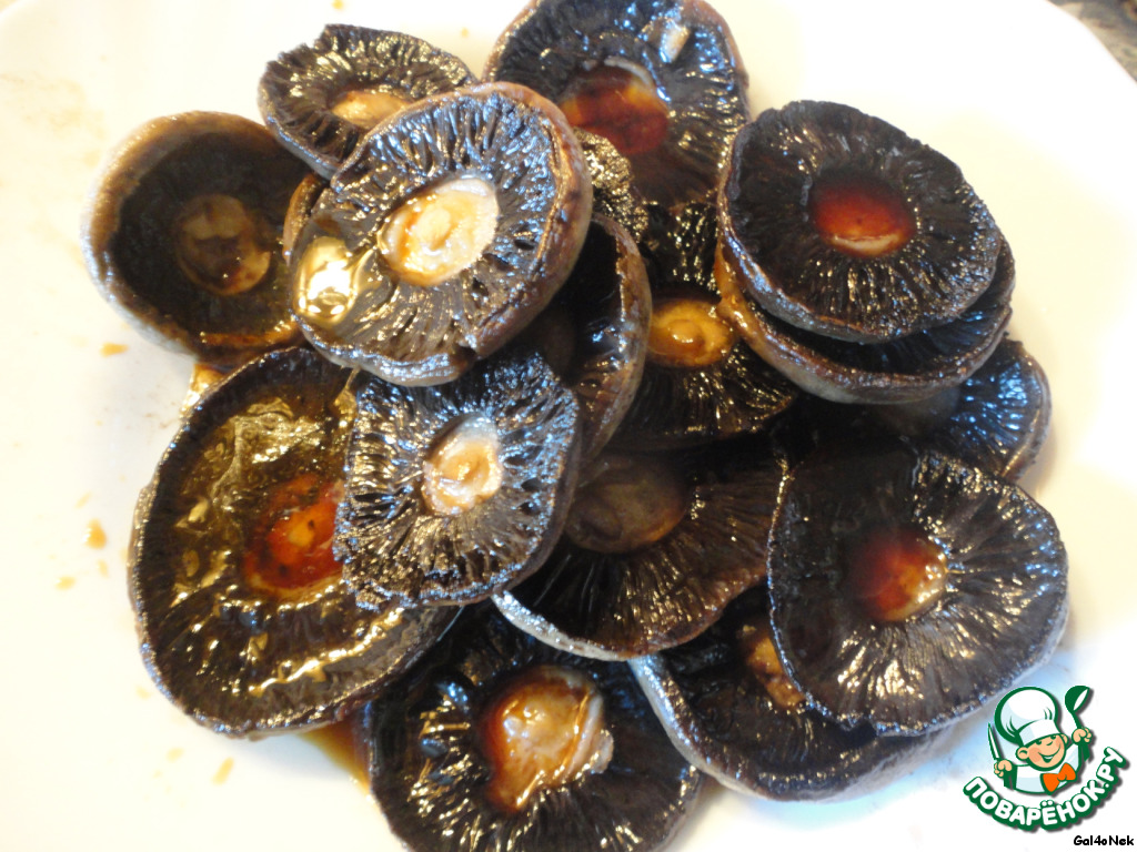 Жареные шляпки залить соевым соусом и дать постоять минут пять.