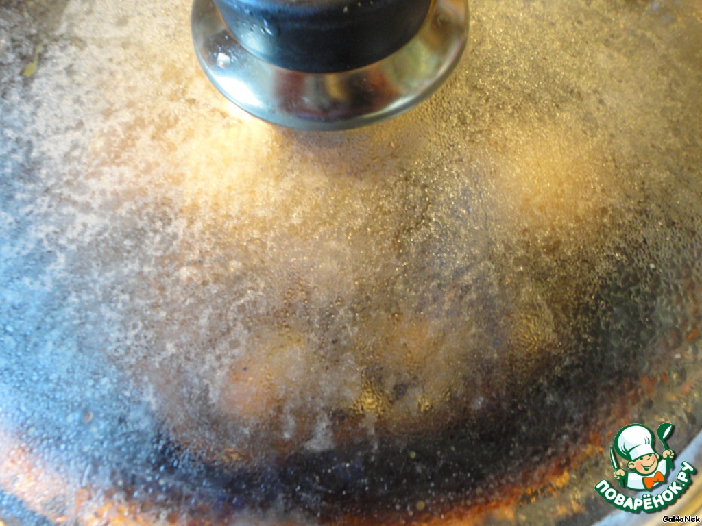 Накрыть крышкой и тушить на достаточно сильном огне до выпаривания жидкости.