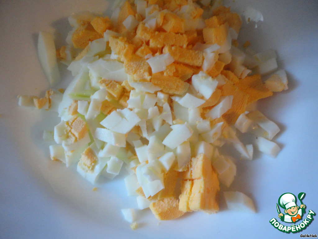 Яйца отварить, нарезать кубиками, остудить.