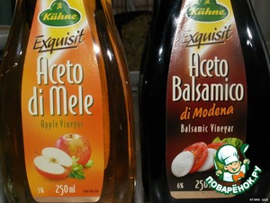 На 100 гр. майонеза добавить 1 ст. л. бальзамического уксуса и 1 ст. л. яблочного уксуса, всe хорошо размешать и заправить этой смесью салат. Посолить по вкусу.
