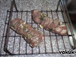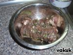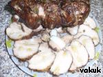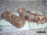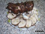 Грудинку начиняем чесноком, натираем перцем и солью, брызгаем соком лимона