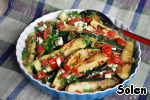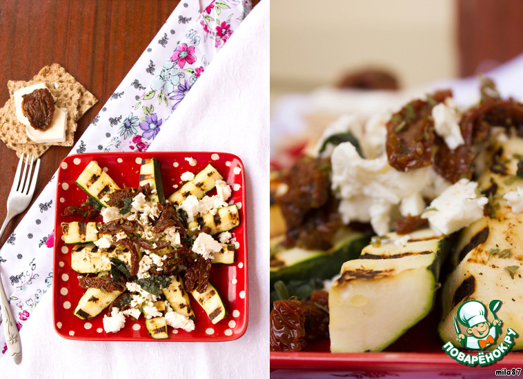 Предназначение этого овощного праздника лета решать Вам: теплый салат, горячий или холодный гарнир, легкий ужин, все возможно. Это блюдо отлично сочетает сладковатые хрустящие цуккини с соленой фетой, прохладной мятой и насыщенным вкусом вяленых томатов. Вяленые томаты можно без проблем заменить измельченными свежими помидорами, главное, чтобы они были очень спелыми и вкусными.