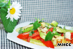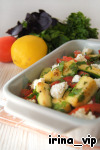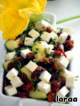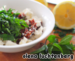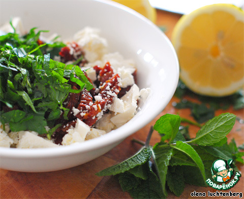 Для заправки мелко нарезать вяленые томаты (или свежие), покрошить фету, измельчить зелень. Выжать сок поллимона и натереть его цедру (конечно, лимон нужно предварительно помыть в теплой воде со щеточкой). Добавить ложку хорошего оливкового масла, немного свежемолотого перца и перемешать.