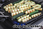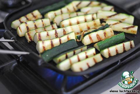 Разогреть сухую сковороду-гриль, на большом огне обжарить, переворачивая, кусочки цуккини до румяных полосочек. Овощ должен остаться очень хрустящим, не передержите, иначе он превратится в неприятную кашу. У меня уходит буквально 3-4 минуты на партию. Сложить в подходящее блюдо.