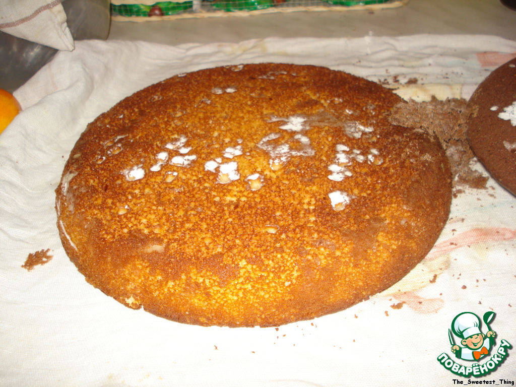 1) Каждый корж разрезаем вдоль, получится 4 (2 белых, 2 черных). Пропитываем каждый корж апельсиновой пропиткой.