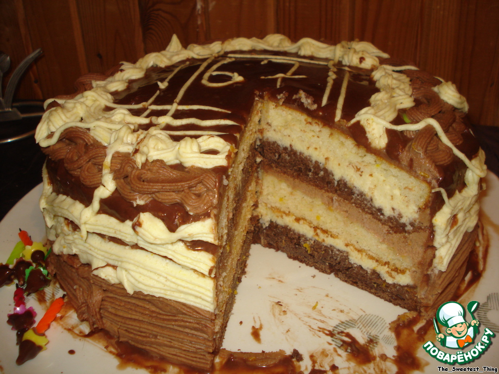 Тортик придумала, взяв за основу несколько рецептов с сайта. Приготовила на Новый год. Торт получается достаточно большой и высокий, правда, придeтся немного повозиться, но отвечаю, это того стоит - торт обалденно вкусный))) Торт с шоколадным и ванильным бисквитом с кремом из белого и черного шоколада с апельсиновой пропиткой. Украшать я пока не очень научилась, украсила как умела, старалась. В первый раз выкладываю рецепт на сайт, поэтому, извините, если что не так)))