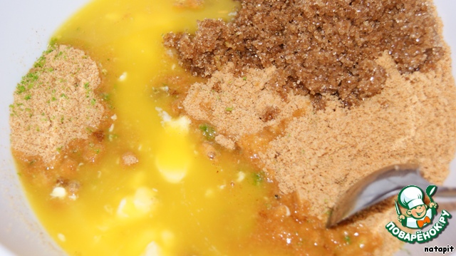 Соединить с маслом, сахаром и по желанию добавить цедру лимона или лайма, можно корицу. Хорошо перемешать.