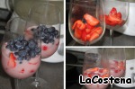 В форму или бокалы выложить свежие ягоды (клубнику и голубику). Залить йогуртовой смесью.