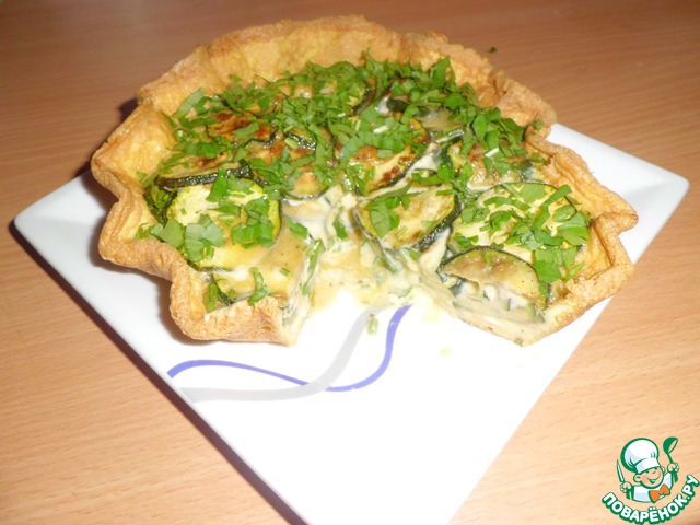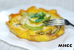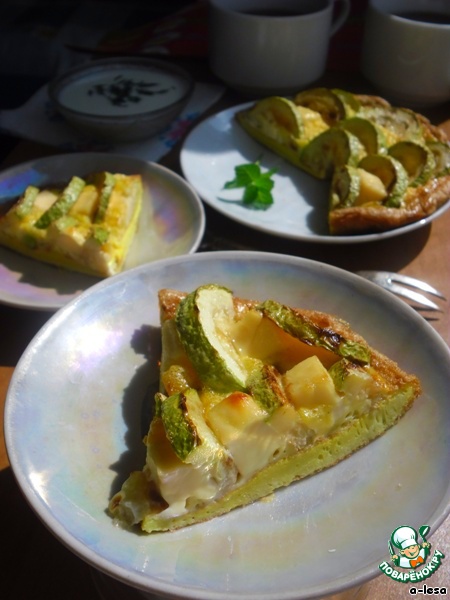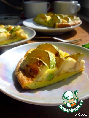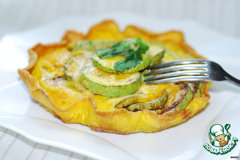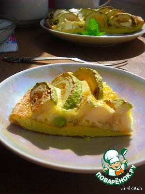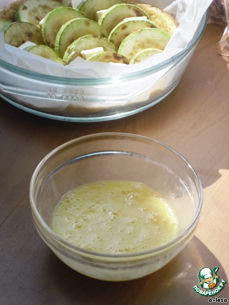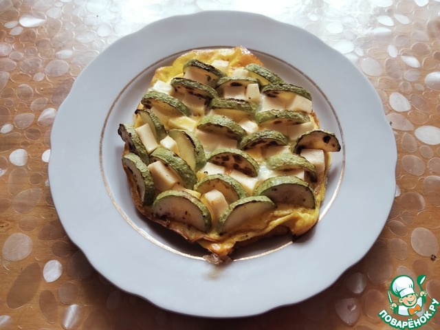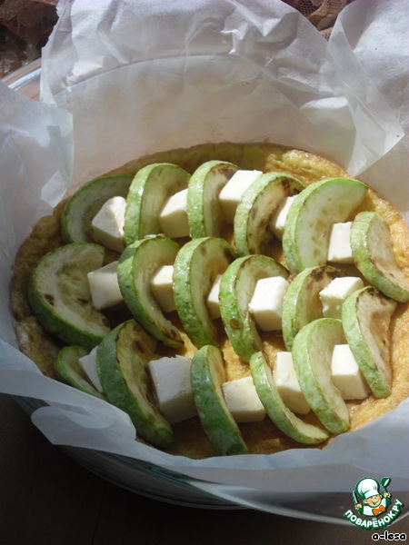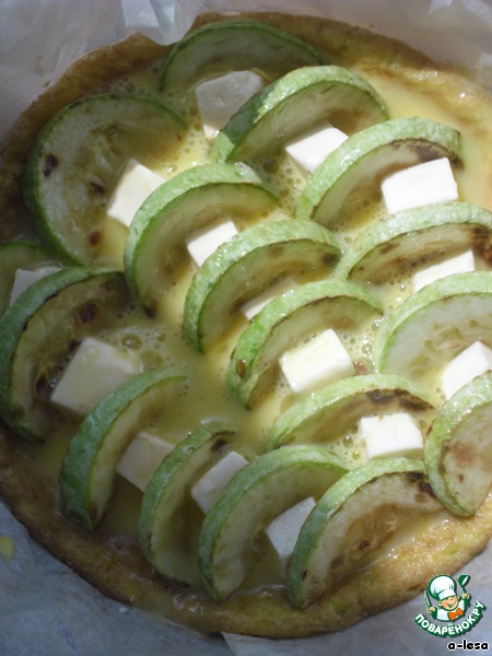 Выложить на фриттату цуккини и сыр, чередуя как на фото,