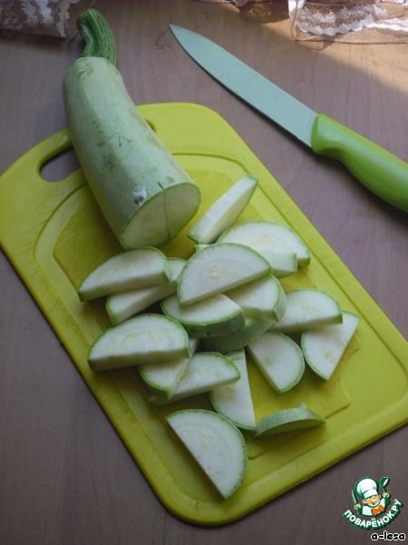Далее цуккини (кабачки, сорт значения не имеет). Помыть и нарезать дольками толщиной примерно 0,5 см.