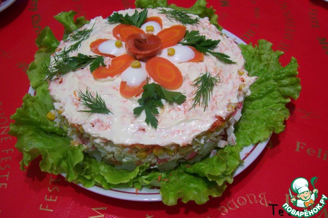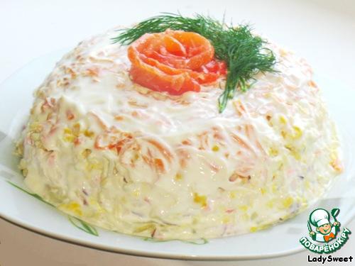 Потрясающе вкусный, нежный салат. Все были просто в восторге))) Рецепт подглядела "ВК". Чуть-чуть изменила, исключила из состава крабовые палочки. Что-то я их совсем разлюбила... Да, и на мой вкус, в этом салате они совершенно лишние)) Делается салат слоями, количество продуктов - произвольное. Я укажу, сколько примерно продуктов ушло у меня.