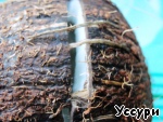 Для начала откроем кокос. Это не так сложно, как кажется. На одной из его макушек-полюсов есть три ямки. Проковыряем одну или парочку отверткой или тонким ножиком. Жидкость, которая находится внутри, сольем, процедим и используем по собственному усмотрению.