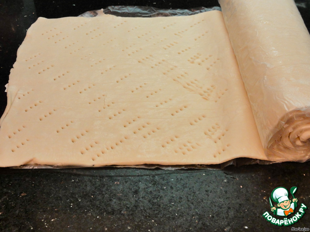 Раскатанное слоенное тесто надкалываем вилкой и отрезаем нужный нам размер.