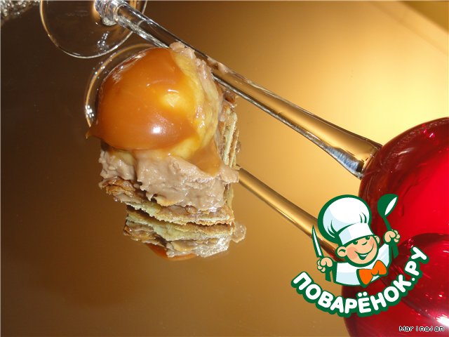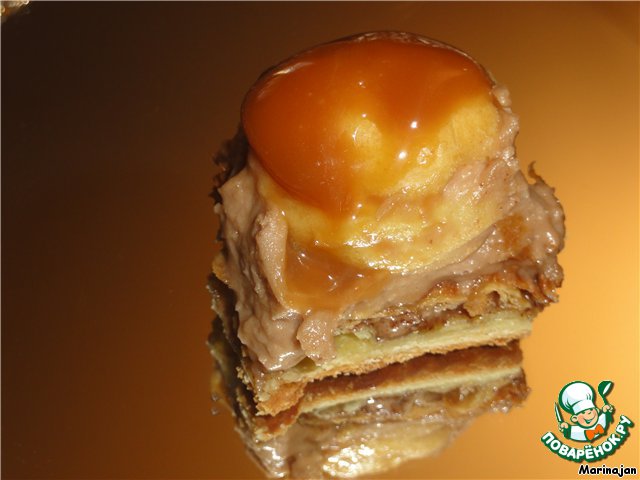 Испеченный слоенный корж смазать кремом ганаш: 100г молочного шоколада залить 200 мл горячих сливок, остудить и взбить миксером, добавить ванилин.