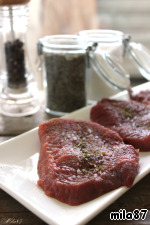 На дно духовки ставим жаропрочную емкость с водой, форму со стейками ставим на третий снизу уровень. Выпекаем 40 минут при 180 градусах.