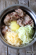 Смешиваем все игридиенты для "верхушки" - грудку, фарш, кабачок, сыр и яйцо.