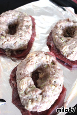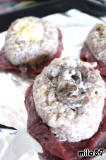 Укладываем куски мяса, на мясо выкладываем слой фарша, оставляя по краям немного места, т.к. в процессе запекания фарш немного разойдется, а мясо ужарится.