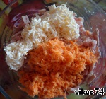 Натрите стружкой морковь и сыр, добаьте их к смеси фарша с колбасой.