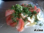 Выкладываем в фольгу картофель с баклажаном и кабачком, добавляем яблоко, перец, помидор (его мелко резать не советую), зелень. Не перемешиваем. Воду тоже добавлять не надо. Сока от овощей будет достаточно. И так все 4 порции.